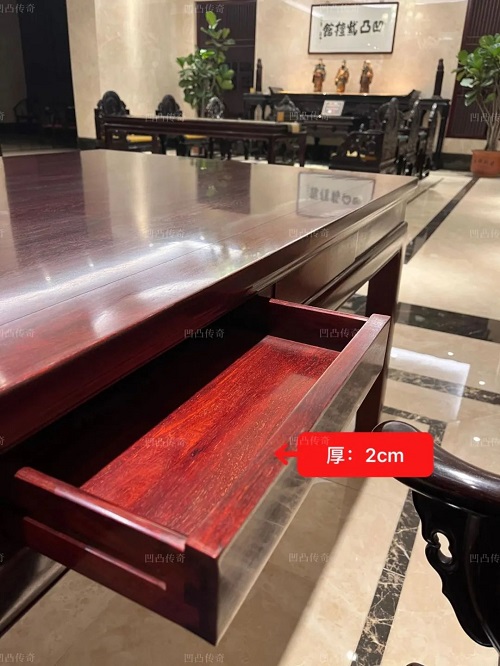 此款茶桌在用料上也毫不吝嗇,總重量達到了114.6kg,其中面框厚5cm,桌腿厚8.5cm,牙板厚4.5cm,抽屜板厚2cm,均超出市場同款型產(chǎn)品的用料標準,每一處細節(jié)都透露著厚重與質(zhì)感。