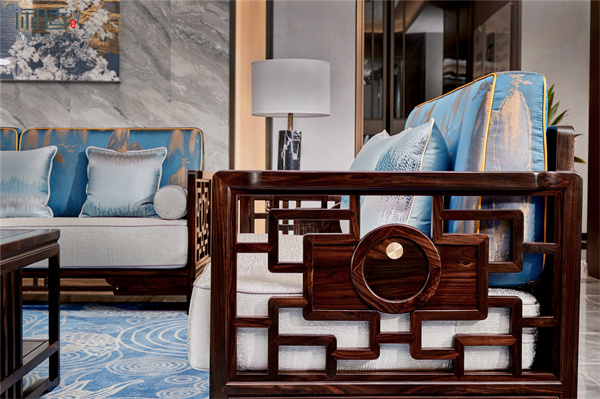 閑適新中式空間會(huì)依據(jù)產(chǎn)品的特性與定位打造與之契合的風(fēng)格,以《賞月沙發(fā)》為例,為了突出清朗獨(dú)特的風(fēng)格,整體空間圍繞淡藍(lán)色色調(diào)展開,精選同色系工藝畫、軟搭與地毯,共同營(yíng)造出清潤(rùn)舒心的感覺。