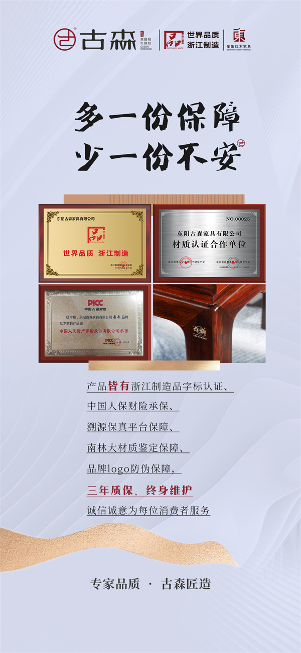 為了確保消費(fèi)者的權(quán)益,古森紅木的每一件產(chǎn)品都提供多重保障。首先,古森紅木產(chǎn)品取得了浙江制造品字標(biāo)認(rèn)證,這是對產(chǎn)品高品質(zhì)的肯定。其次,古森紅木與中國人保財險合作,為產(chǎn)品提供質(zhì)量保險,確保消費(fèi)者的利益得到最大程度的保障。此外,古森紅木還擁有溯源保真平臺和南林大材質(zhì)鑒定等權(quán)威機(jī)構(gòu)的支持,每一件古森紅木家具都帶有品牌logo防偽標(biāo)簽,讓消費(fèi)者在購買時更加放心。