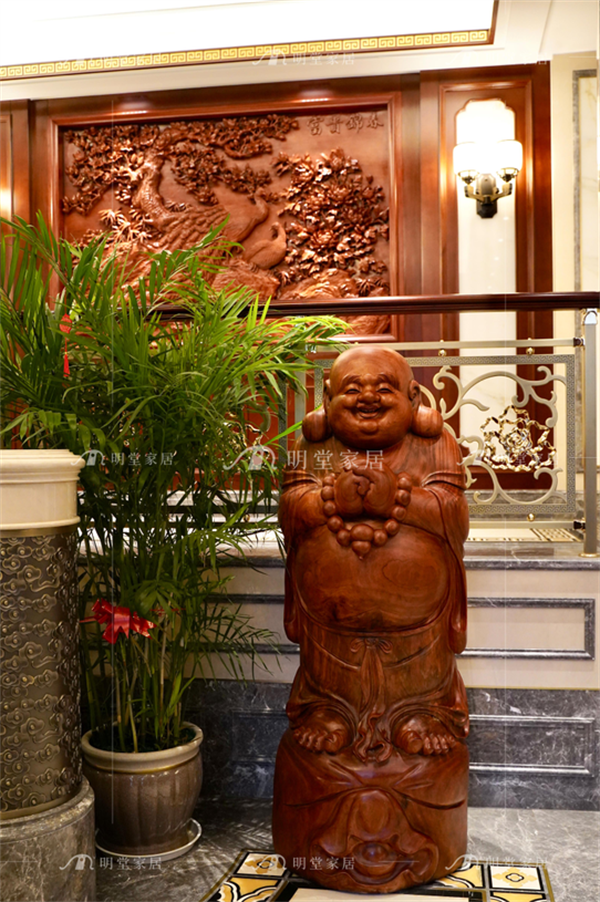 隔斷后方,便是挑高設(shè)計的客廳空間。首先映入眼簾的是那憨態(tài)可掬的彌勒佛,笑臉迎客,讓人心生歡喜。進(jìn)入客廳,其高挑的空間和清式家居沙發(fā)的大氣設(shè)計,讓人不禁為之震撼。這些沙發(fā)純手工制作,每一塊木板、每一塊木頭都是珍貴的大紅酸枝,顯得奢華而大氣。背景墻上掛著名家畫作,墨色淋漓,與紅木家具相互映襯,彰顯出主人的非凡品味與文化底蘊。
