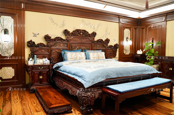 紅木書房中,每一寸空間都散發(fā)著沉靜與智慧的光芒。紅木家具的沉穩(wěn)色澤與細(xì)膩紋理,為這個知識的殿堂增添了一份歷史的厚重感,仿佛能夠穿越時空,與歷代文人墨客對話。紅木座椅設(shè)計考究,既保證了舒適度,又不失典雅。業(yè)主可在此處放松身心,與書本為伴,與思想為友,感受到紅木帶來的那份沉靜與專注。《禮記·內(nèi)側(cè)》說:“安其寢處,安之法,床為要?!奔t木床,作為中式的經(jīng)典元素,配置在中式風(fēng)格的臥室中,能夠營造出大氣雅致,而又不失寧靜溫馨的居室氛圍。躺在床上,深吸一口氣,空氣中彌漫著紅木淡淡的清香,味可安神,伴隨美夢入眠。