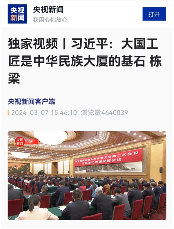 近日,習(xí)總書記在參加十四屆全國(guó)人大二次會(huì)議江蘇代表團(tuán)審議時(shí)的重要講話,引起了熱烈反響,他表示:“大國(guó)工匠是我們中華民族大廈的基石、棟梁”,深刻揭示了工匠精神在中華民族復(fù)興偉業(yè)中的重要地位和作用。