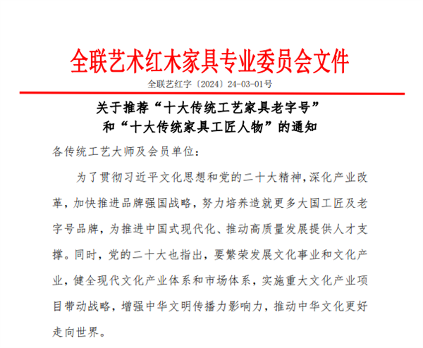 同時,為了能更好的傳承與傳播傳統(tǒng)工藝文化,培養(yǎng)更多老字號品牌,全聯(lián)民間文物藝術(shù)品商會、民間傳世工程組委會及全聯(lián)非遺文化保護中心在2024年將開展“十大傳統(tǒng)工藝家具老字號”的評選活動,推薦以傳統(tǒng)手工藝為發(fā)展基底的優(yōu)秀企業(yè)參選。