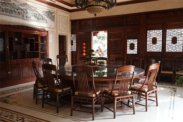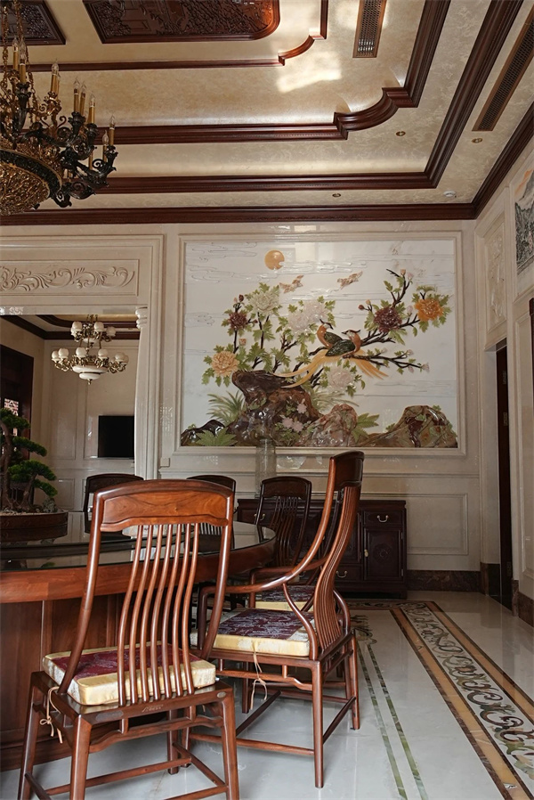 當(dāng)賓客滿堂,全榫卯結(jié)構(gòu)的輔房便成了聚餐的最佳場所。上方懸掛的“龍馬強(qiáng)盛”牌匾,不僅承載著主人的生肖與姓名,更是一種精神的象征。室內(nèi)大理石與緬甸花梨木的結(jié)合,以及緬花吊頂?shù)难b飾,無不展現(xiàn)出對(duì)生活品質(zhì)的極致追求。