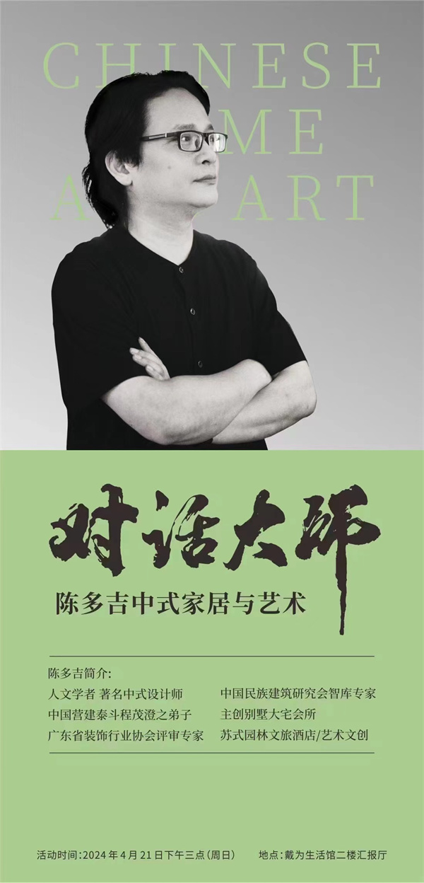 我們永遠(yuǎn)為中式浪漫而折服,惹得人想進(jìn)一步地探尋究竟,為此,本月21日,我們邀請(qǐng)了人文學(xué)者、著名中式設(shè)計(jì)師陳多吉先生,一同在戴為生活館二樓報(bào)告廳,探尋中式家居與藝術(shù)的無(wú)盡魅力。屆時(shí),陳多吉大師將用他的智慧與才華,為我們揭示中式家居設(shè)計(jì)的獨(dú)特韻味與深邃內(nèi)涵。