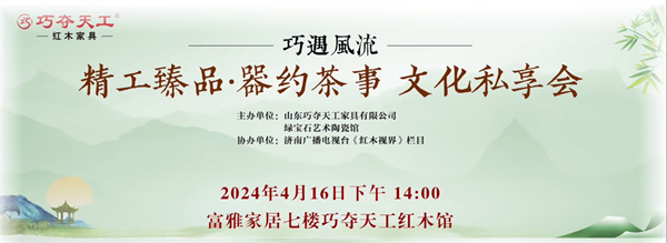 春風(fēng)輕拂,綠意盎然。在萬(wàn)物復(fù)蘇之際,一場(chǎng)關(guān)于茶與器的文化盛宴即將在山東濟(jì)南巧奪天工紅木館(濟(jì)南市天橋區(qū)北園大街與生產(chǎn)路交會(huì)處富雅家居七樓)華麗啟幕。