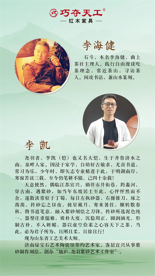 有年輕力量—國(guó)家一級(jí)工藝美術(shù)師、青年書(shū)畫(huà)家史振星,有大師力量—山東省博物館學(xué)會(huì)陶瓷專(zhuān)業(yè)委員會(huì)專(zhuān)家委員、綠寶石藝術(shù)陶瓷館館長(zhǎng)朱東明,山東省工藝美術(shù)大師、“翹廬.堯羽紫砂藝術(shù)工作室”主理人李凱,有傳承力量—曲上茶社主理人李海健,田氏鋦瓷的第四代傳人田曉兵等嘉賓將蒞臨私享會(huì)現(xiàn)場(chǎng),相會(huì)茶器精品之美。