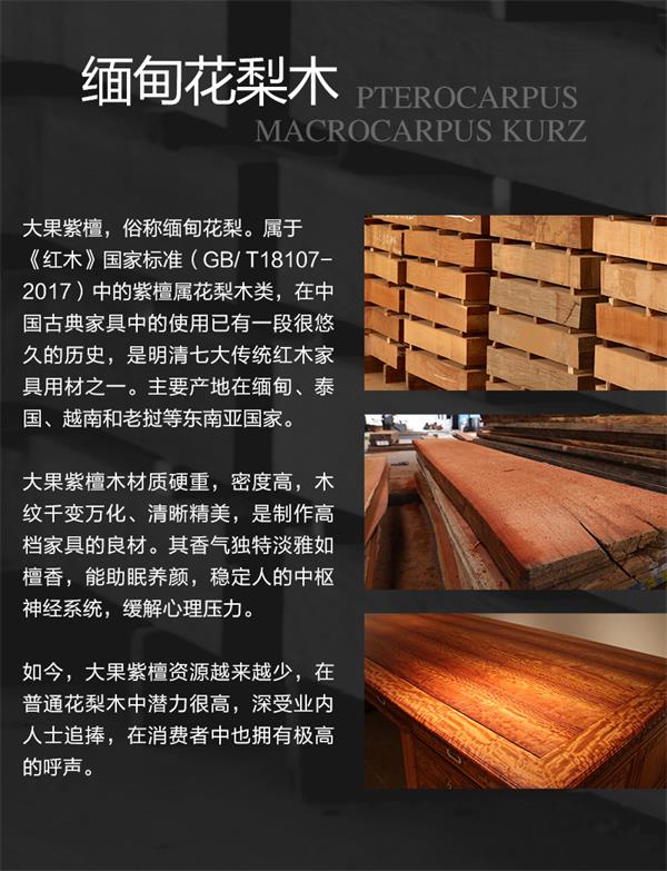 大果紫檀,俗稱緬甸花梨,中國明清七大傳統(tǒng)紅木家具用材之一。在晚清民國的時候,黃花梨幾近枯竭,緬甸花梨木作為黃花梨的替代和補充,被大量引入國內作為名貴家具用材。國壽紅木作為專業(yè)生產緬甸花梨精品家具的企業(yè),為什么偏愛緬甸花梨?也許從色彩上可以找到一些答案。