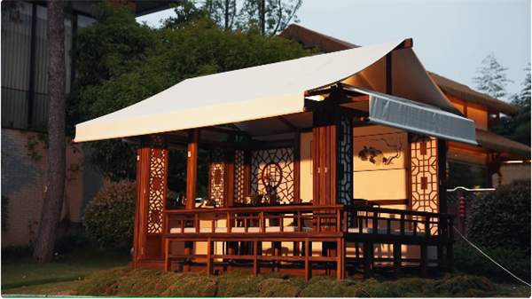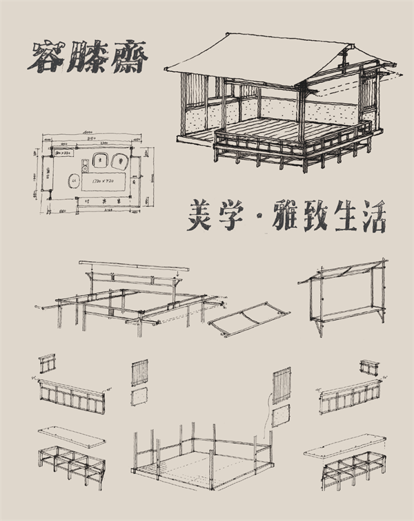 容膝齋茶屋,傳承宋韻新風(fēng)。由松喬工匠子龍?jiān)O(shè)計(jì),以元代《容膝齋》圖為靈感,融合精神人文與工藝技術(shù)。此畫(huà)的畫(huà)面凈逸高古,圖中容膝茶齋,形簡(jiǎn)構(gòu)潔,無(wú)一筆多余,想必乃是宋人高遠(yuǎn)曠達(dá)純凈俊朗、形素不侈之古韻新風(fēng)。