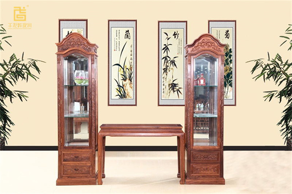 干龍軒《玻璃酒柜配明式案臺(tái)》,玻璃紅木酒柜能清晰盡顯藏品之美,又能防塵防濕。明式案臺(tái)線條流暢,簡(jiǎn)約而不失韻味。兩者搭配,既顯現(xiàn)代感又帶古典韻,相得益彰。
