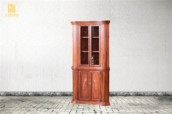 干龍軒《檀雕三角柜》,此柜子整體頗有宮廷風(fēng)格,典雅大方,可分為上下兩個(gè)部分,上方是三層帶玻璃門的展示柜,可放置酒與藏品展示出來(lái),下層是雙開(kāi)柜,柜門上雕刻精美圖案,儲(chǔ)物空間大,這是一個(gè)實(shí)用與美感具備的三角柜。