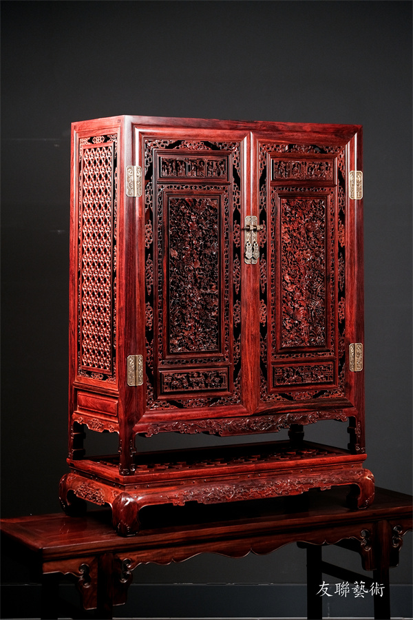 形制規(guī)整,柜門設(shè)計(jì)以三層雕花板攢接而成。外部兩圈以透雕為主,鏤空雕刻拐子龍紋,繁復(fù)精致。兩旁則采用鏤空窗欞造型,為整體增添了一抹意境之美。