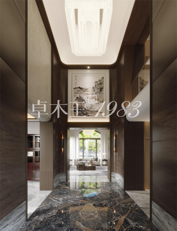 廊廳中,紋理流動的大理石和紅木家具之間的無聲融合,在光影的映照,下呈現(xiàn)出絢爛高雅的空間氣質(zhì)。