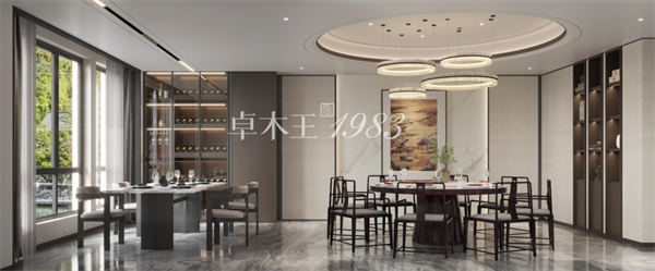 整裝定制的餐廳空間,將名貴紅木與東方元素、現(xiàn)代設(shè)計(jì)、精致裝飾巧妙結(jié)合。如樂曲般律動的圓形定制吊頂,賦予餐廳空間自然且沉著的質(zhì)感。