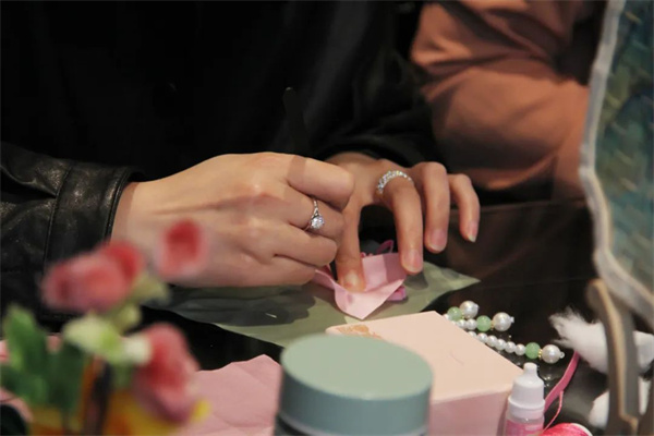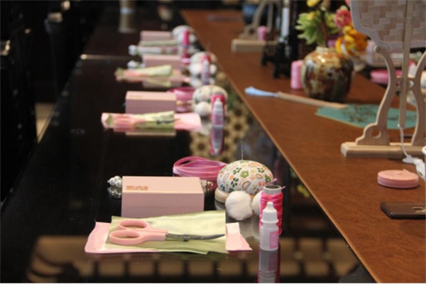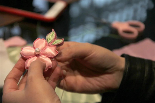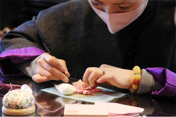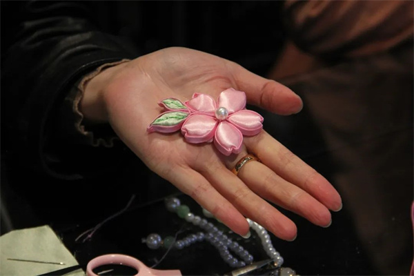 在老師的指導(dǎo)下,學(xué)員們紛紛動(dòng)手制作,通過裁剪、縫制、纏繞等步驟,一朵朵精致的桃花盤扣逐漸在大家手中綻放成形。