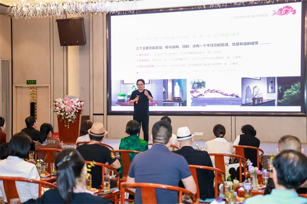 在演講過程中,陳多吉老師還分享了如何鑒賞器型之美,以及石、字畫、盆景、茶具、布藝等元素在陳設居所中的點綴作用。