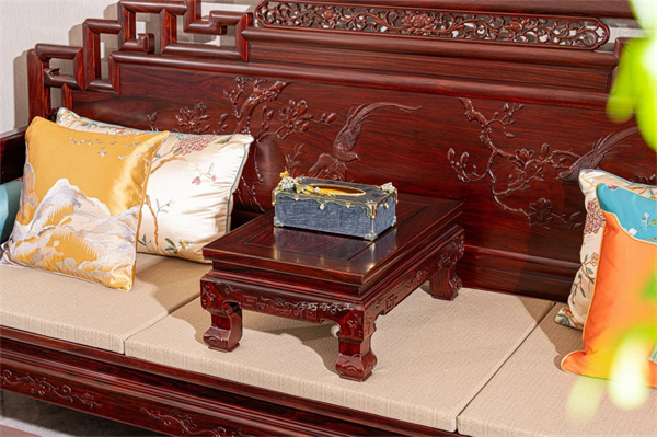 雕花繁復(fù),花鳥(niǎo)圖案躍然其上,盡顯中華傳統(tǒng)文化的韻味。抱枕的圖案設(shè)計(jì)亦頗具中式風(fēng)情,與沙發(fā)的花鳥(niǎo)主題相得益彰。