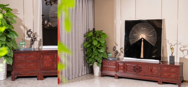 沙發(fā)對(duì)面的鵬程萬(wàn)里電視柜,線條自然流暢,造型大氣沉穩(wěn)。
