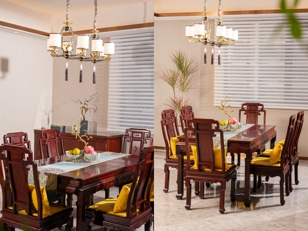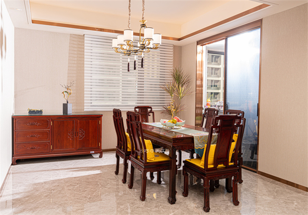 走進(jìn)餐廳,首先映入眼簾的是一張古樸典雅的紅木長(zhǎng)方桌。