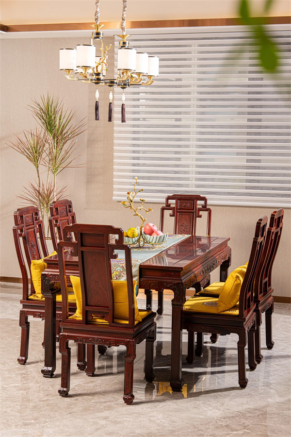 椅背上雕刻著一株植物,枝葉舒展,栩栩如生,而椅子上的坐墊則是明亮的黃色,與紅木的顏色形成了鮮明的對(duì)比,為整個(gè)餐廳增添了一抹亮色。