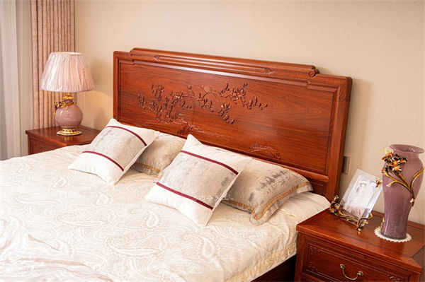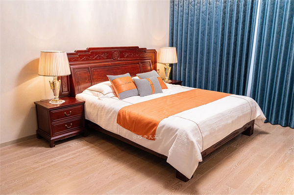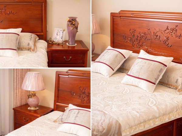 兩間臥室,雖風(fēng)格迥異,但都展現(xiàn)了紅木家具的設(shè)計(jì)巧思,讓人在其中感受到了一種寧?kù)o與舒適。