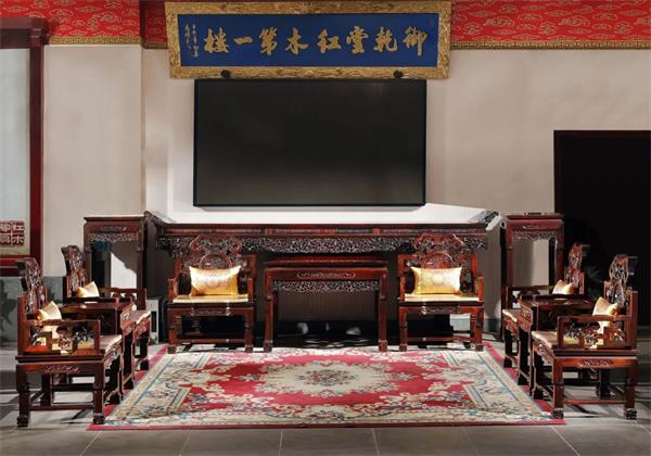 館內(nèi)每一件紫檀家具,都是用老料精心制作而成,散發(fā)著溫潤深幽的光澤。