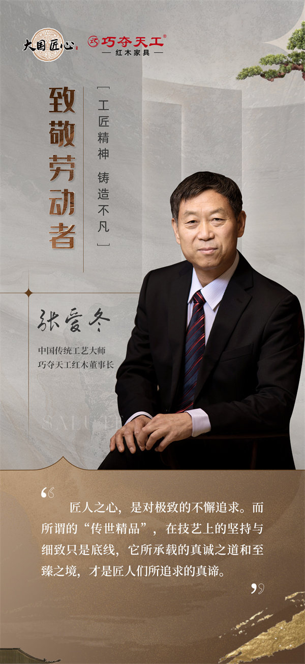 中國(guó)傳統(tǒng)工藝大師、巧奪天工紅木董事長(zhǎng)張愛(ài)冬匠心語(yǔ)錄:匠人之心,是對(duì)極致的不懈追求。而所謂的“傳世精品”,在技藝上的堅(jiān)持與細(xì)致只是底線,它所承載的真誠(chéng)之道和至臻之境,才是匠人們所追求的真諦。