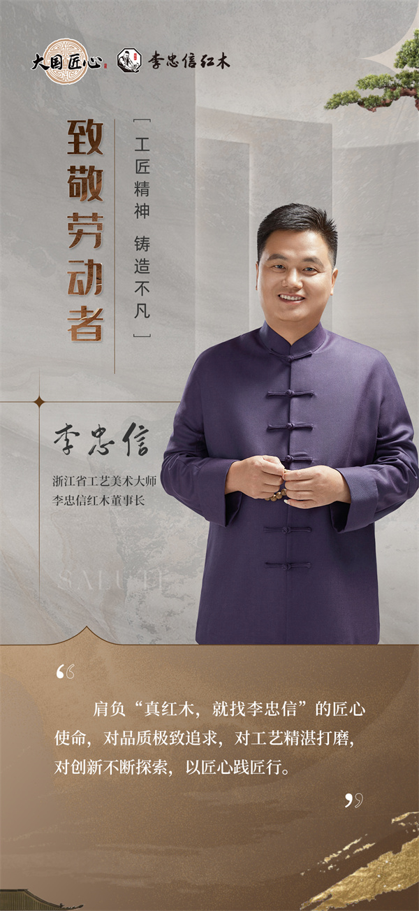 浙江省工藝美學(xué)大師、李忠信紅木董事長李忠信匠心語錄:肩負(fù)“真紅木,就找李忠信”的匠心使命,對品質(zhì)極致追求,對工藝精湛打磨,對創(chuàng)新不斷探索,以匠心踐匠行。