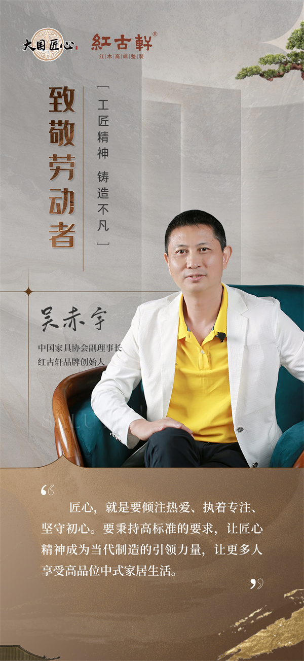中國(guó)家具協(xié)會(huì)副理事長(zhǎng)、紅古軒品牌創(chuàng)始人吳赤宇匠心語錄:匠心,就是要傾注熱愛、執(zhí)著專注、堅(jiān)守初心。要秉持高標(biāo)準(zhǔn)的要求,讓匠心精神成為當(dāng)代制造的引領(lǐng)力量,讓更多人享受高品位中式家居生活。