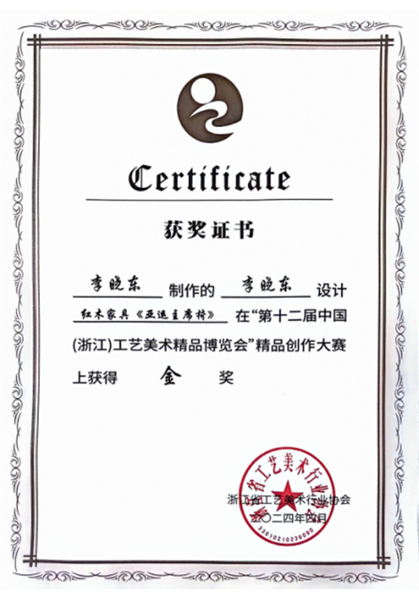 在此次展覽中,旭東紅木作品表現(xiàn)出色,斬獲佳績。其中,《亞運主席椅》憑借獨特設(shè)計和卓越品質(zhì)榮獲金獎,展現(xiàn)了旭東紅木在家具制作領(lǐng)域的卓越成就。