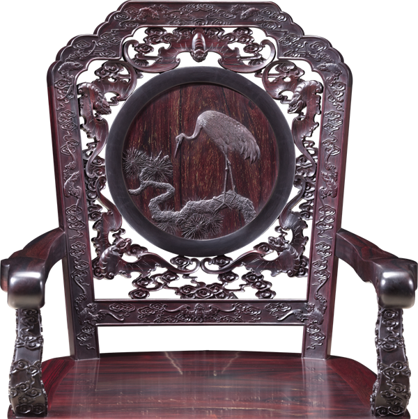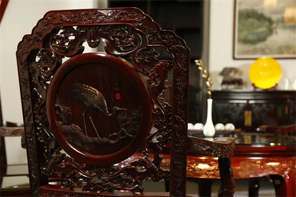 椅背上浮雕的松鶴與透雕的蝙蝠相結(jié)合,虛實(shí)相間,空靈有致。兼具傳統(tǒng)風(fēng)韻和時(shí)代精神,將松、鶴、蝙蝠、云彩等傳統(tǒng)紋飾融入家具設(shè)計(jì),輔以創(chuàng)新木雕“絲翎檀雕”,古典與現(xiàn)代完美交融,打造返樸歸真的詩(shī)意空間。