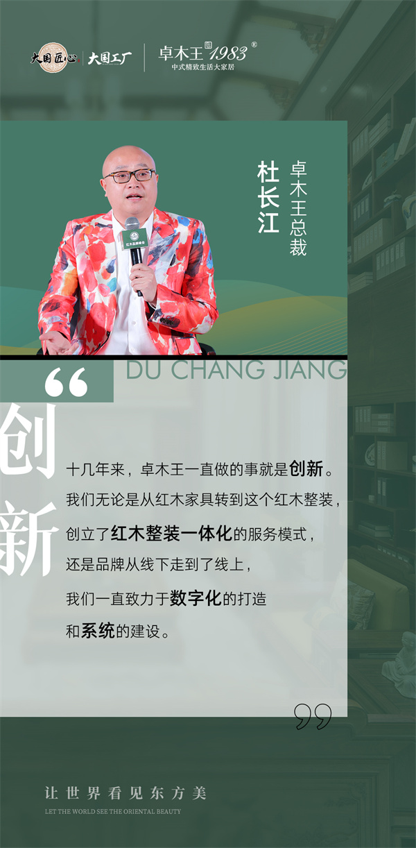 紅木全屋定制模式發(fā)展至今,已然成為行業(yè)新的增長點(diǎn),卓木王作為最早提出該模式的企業(yè),以傳統(tǒng)文化和工藝為基礎(chǔ),深入研究精致生活方式,已擁有一套成熟的集成體系。在此背后,離不開杜長江以前沿思想與互聯(lián)網(wǎng)思維,帶領(lǐng)著團(tuán)隊(duì)多年間的不斷精進(jìn)創(chuàng)新。