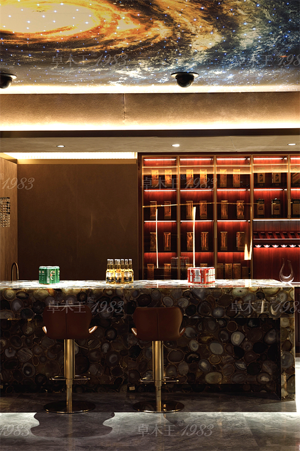 貴族棕和瑪莎拉紅色的點綴,讓空間更具氛圍感,貝殼云母結(jié)合大理石制成的水晶酒吧臺,將大自然的靈動展現(xiàn)的淋漓盡致。在這樣一個空間里,卸下一天的疲憊,可以小酌一杯,也可約三兩好友相聚于此,生活因此更有意義。
