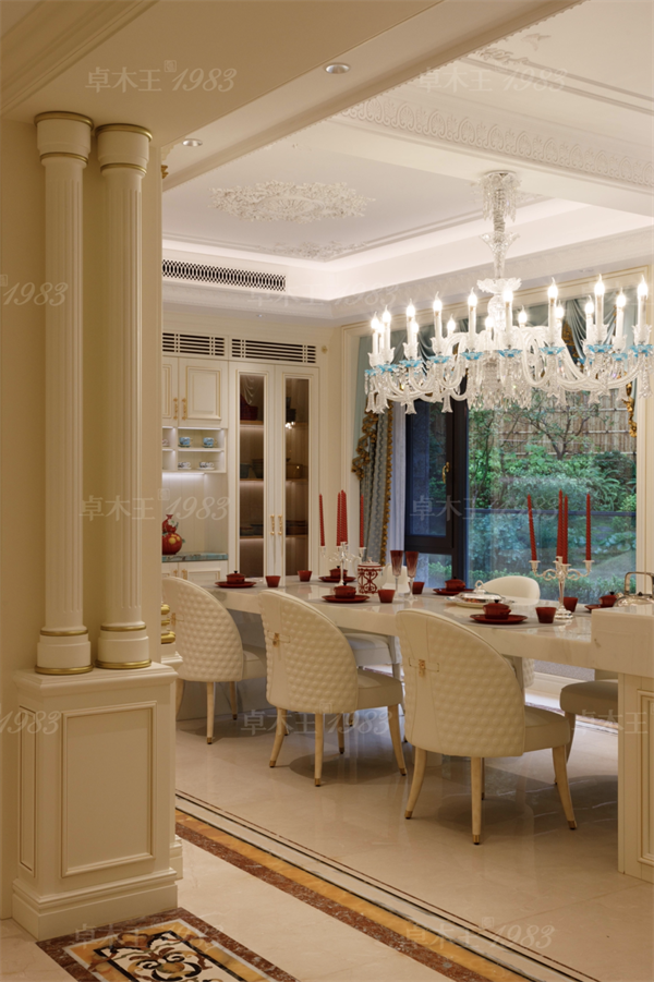 自帶著功能屬性的高柜體餐邊柜設(shè)計,成為空間的視覺中心。簡約大氣的吊頂設(shè)計,搭配精致雕花圖案的同時,配以雙色燈飾,演繹沉浸又有溫度的空間氛圍。氣勢恢宏的空間立柱、燕尾服造型的餐椅設(shè)計、異域風(fēng)情的花色大理石,將餐廳空間的簡構(gòu)表達融合的恰到好處。