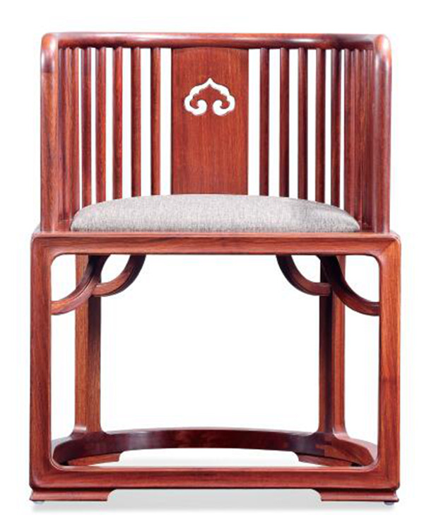作為新明式風(fēng)格的杰出代表,《國壽椅》兩度受邀參加美國洛杉磯藝博會中國國家展。其巧妙地融合了粽角榫、凹面線、霸王棖、直欞式樣以及如意云紋等經(jīng)典明式家具元素,經(jīng)過精心重組與改良,展現(xiàn)出極高的辨識度和獨特的藝術(shù)魅力。