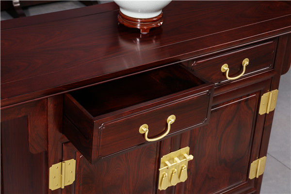 通過銅件的鑲嵌和連接,紅木家具的各個部件得以緊密地結合在一起,形成了一個穩(wěn)固的整體。這種設計不僅增強了家具的實用性,也使其更加耐用,經(jīng)得起時間的考驗。