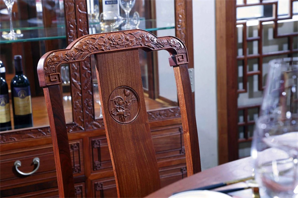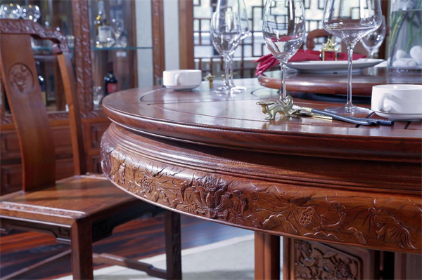 在桌面上,雕刻著精美的蓮花紋,每一朵蓮花都圓潤飽滿,高潔典雅,展現(xiàn)出匠人精湛的雕刻技藝。這些蓮花紋不僅增添了餐桌的美感,更寓意著家庭的和諧與美好。