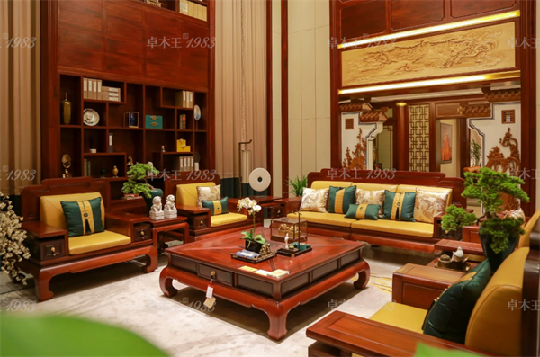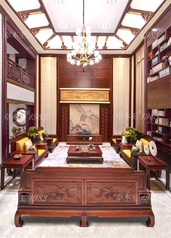 本案紅木整裝客廳,精選高端紅木、大理石、黃銅、琉璃等多種材質巧妙搭配,大氣典雅的空間兼具功能與中式美感,方寸間盡顯空間的尊貴氣質。