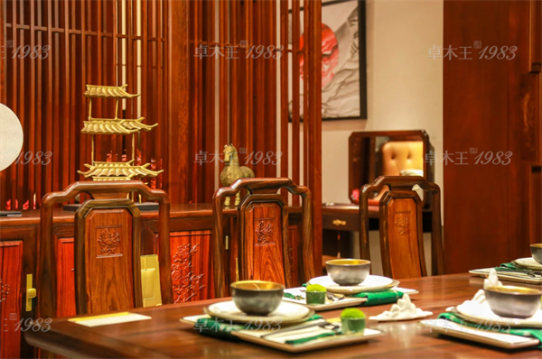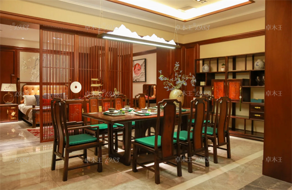 半壁山房待明月,一盞清茶酬知音。半開放式餐廳空間,以化繁為簡的美學思想與溫潤如玉的紅木融于一體。