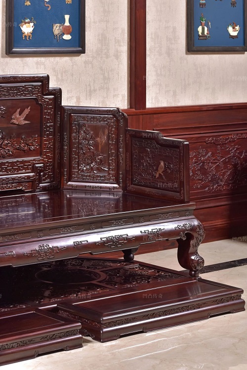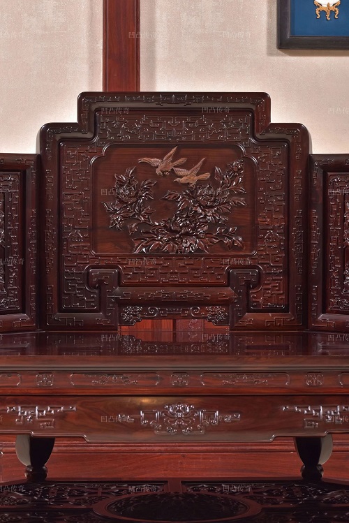 沙發(fā)上的雕刻工藝尤為引人注目。牡丹花作為國(guó)花,被巧妙地雕刻在沙發(fā)之上,花瓣層層疊疊,婀娜多姿,宛如真花綻放,展現(xiàn)出無盡的生機(jī)與活力。
