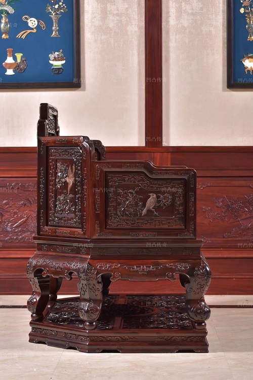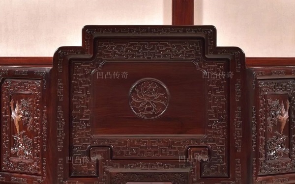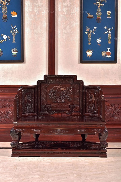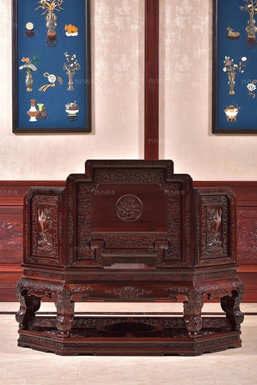 座面后部為折沿式,前部中段內(nèi)凹,它沿襲了清·紫檀木雕花漆心寶座的特點(diǎn),擁有五個(gè)面的圍板設(shè)計(jì),這在傳統(tǒng)的寶座家具中較為罕見。