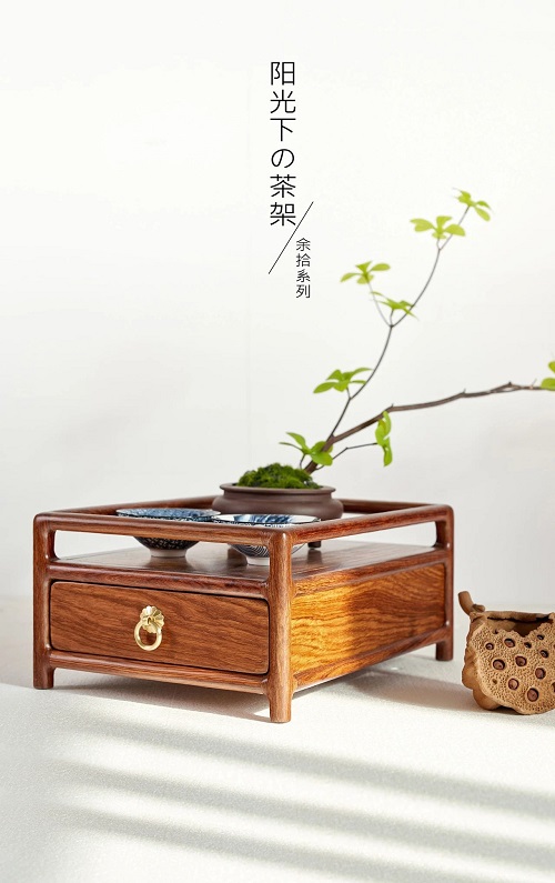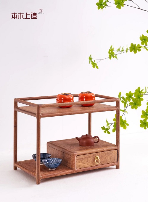 茶架的設(shè)計(jì)簡約而優(yōu)雅,上下層皆有收納空間,下方還帶有一個(gè)抽屜,方便收納一些零散的茶具或茶葉,讓桌面更整潔,抽屜上的銅件拉手,讓整個(gè)茶架看起來更精致。