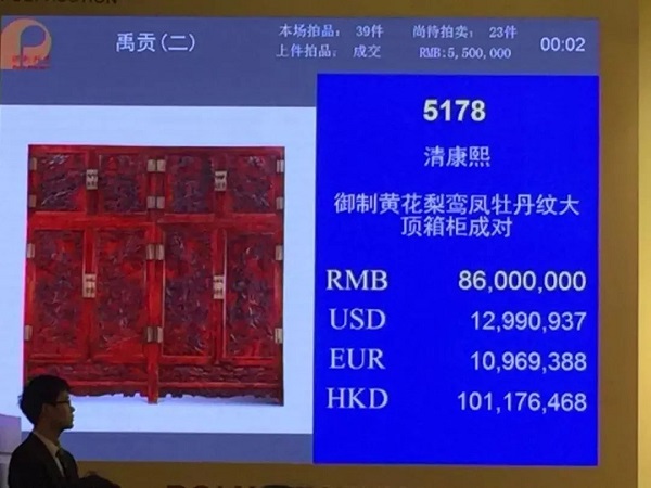 2017年北京四季酒店的保利拍賣現(xiàn)場,一對多年來“只有傳說留在江湖”的《清康熙御制——黃花梨鸞鳳牡丹紋大頂箱柜》,加上傭金最后成交價(jià)為9890萬元,刷新當(dāng)年中國古典家具拍賣最高紀(jì)錄!
