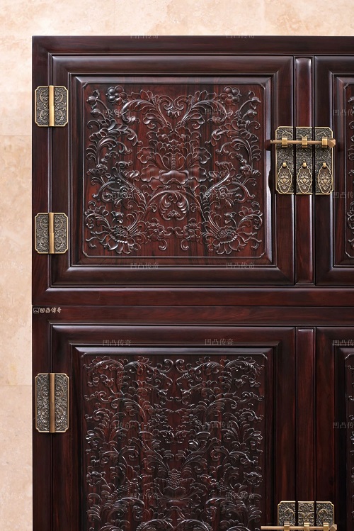 八扇柜門和柜膛立板均采用了鏟地高浮雕技法,雕刻工藝精細(xì)入微,布局繁簡得當(dāng)。西番蓮紋樣在每一處都顯得栩栩如生,花瓣繁復(fù)而又不失優(yōu)雅,葉片脈絡(luò)清晰可見,仿佛散發(fā)著淡淡的香氣。