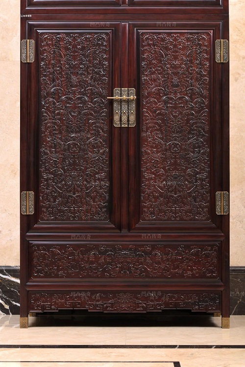 此柜銅面頁和吊牌相當(dāng)講究,造型典雅,鏨刻圖案精美,既富裝飾效果,又與大紅酸枝柜體色澤反差強(qiáng)烈,能沖淡大型家具給人的沉悶感。