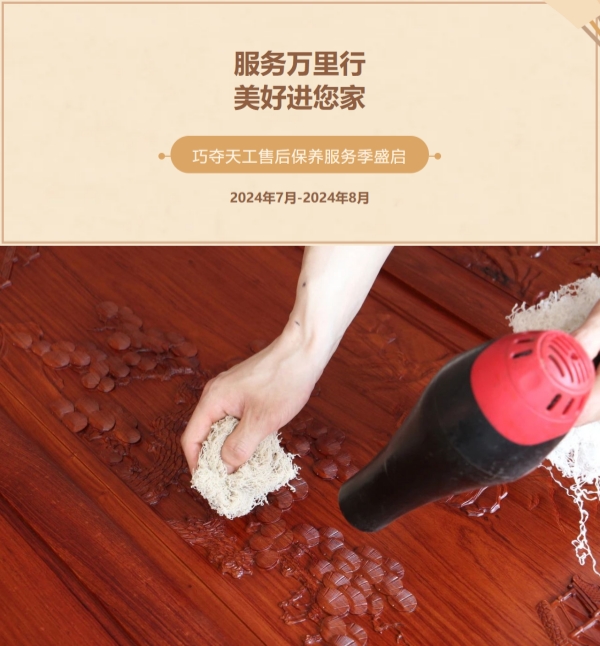 近日,巧奪天工紅木推出以“服務(wù)萬里行,美好進您家”為主題的上門保養(yǎng)服務(wù),活動時間為2024年7月-2024年8月,有需要上門保養(yǎng)的客戶可在此期間內(nèi)聯(lián)系預(yù)約。