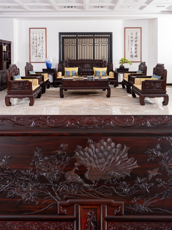 《前程似錦沙發(fā)》,也汲取了泰山的磅礴氣魄,其整體造型展現(xiàn)出肅穆端莊之美,滿雕工藝疏密有致,碩大的花團簇擁著氣宇軒昂的孔雀,光彩奪目。