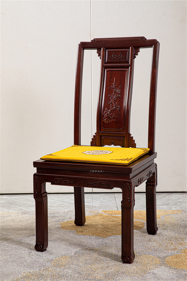 餐椅的設(shè)計更是別具匠心,后背階梯狀上升,后背板雕刻梅花,五瓣綻放,寓意五福臨門,生活美滿。牙條與搭腦上,卷草紋纏繞,象征著福慶連綿,生生不息。