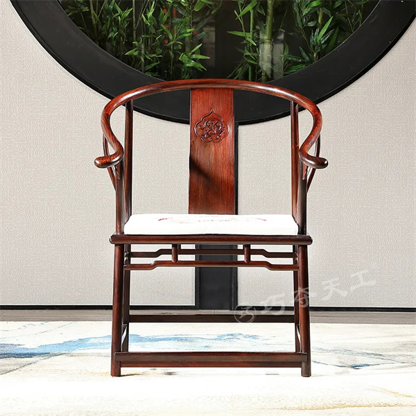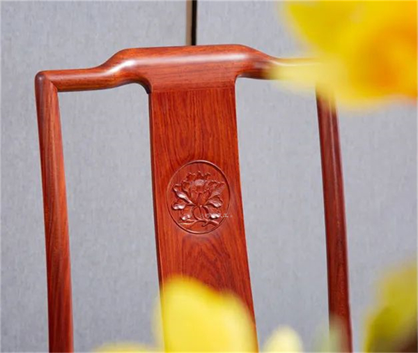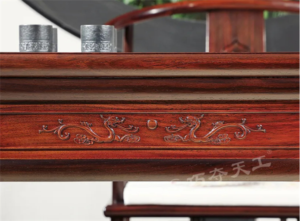 椅子的設(shè)計精妙融入傳統(tǒng)圈椅的韻味,更在細節(jié)上進行創(chuàng)新。椅背上,雙龍戲珠的圖案栩栩如生,與茶桌的風(fēng)貌交相輝映。