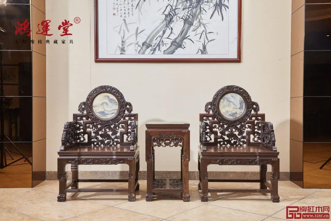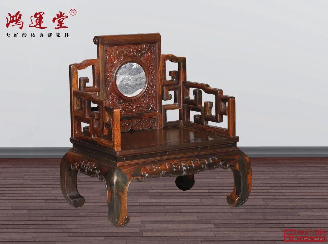 搭腦鑲嵌圓形天然大理石,紋路宛如水墨山水畫,自然唯美、古樸自然,為整個(gè)椅子增添了別樣的色彩,透露著美好的文化寓意與祝愿。